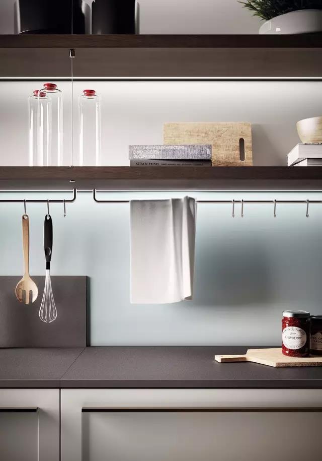 Carattere的其他創意元素包括可以吸附磁性廚房配件(炊具掛杆、調料瓶架、廚房紙巾架等)的特殊護牆板、直接安裝在牆櫃或擱板底部的掛杆、島台側面的毛巾杆、獨特造型的煙機罩、可同時用於起居室單元的島台櫃腿……
